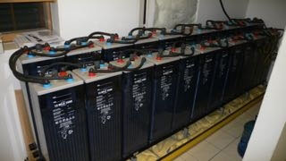 12 Batteries with 48 Volts and capacity of 1600 Amp/hours are loaded by Solar Panels, when sun is shining and by Generator on cloudy days.